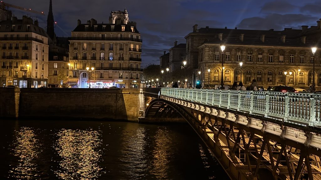 After that, it was time to find our way back, which turned into a silly adventure. It did not occur to me to open a map app to get to a taxi stand, we we took a wrong turn on the street. Finally we gave up and I flagged down a tax just coming off L’Ile de la Cite and we jumped in just around the corner. The driver didn’t speak any English, but I managed to communicate the name of our hotel, and a standard fare later, we arrived back and ready for bed. While she was waiting at the corner, Gail took this photo across the Seine back towards L’Ile de la Cite (you can make out a bit of Notre Dame in the background.