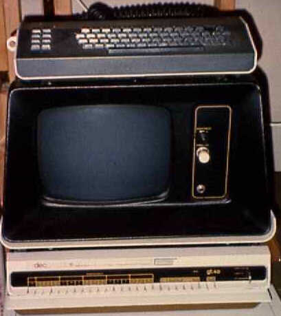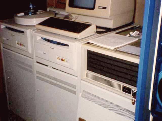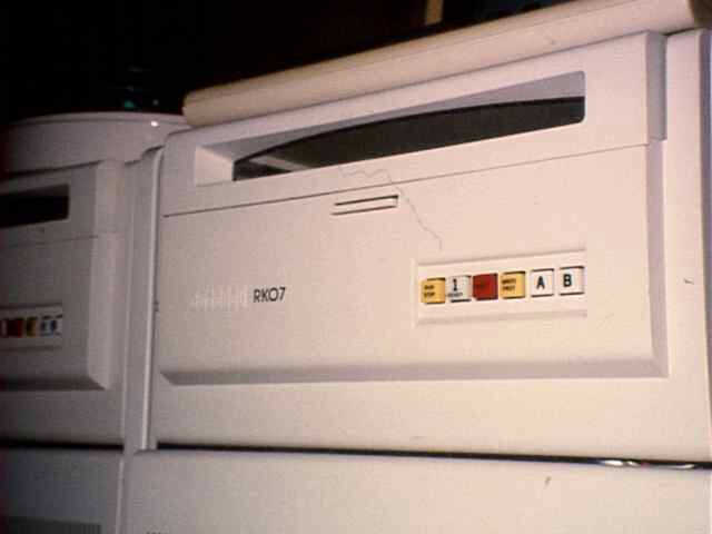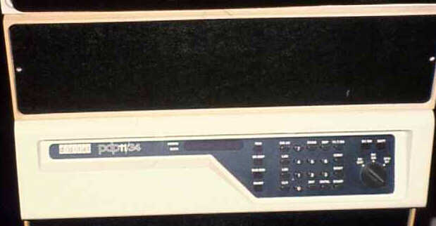 The PDP-11/24In this somewhat cluttered PDP-11/24 system picture, you can see the VT100 terminal and RK07 disk drives that we obtained with the system. Not visible in this picture is the TU10 we obtained at that time. It is stored in a rack along the west wall (it is a completely different vintage than the PDP-11/24, in any event).