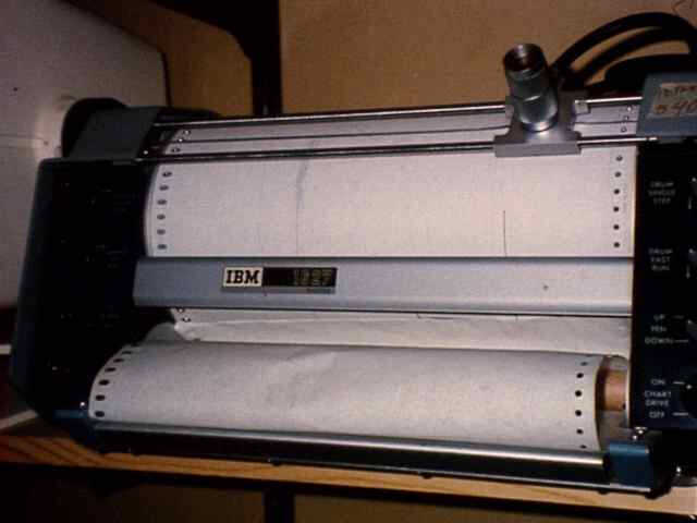 RX01One interesting peripheral I have obtained is an IBM 1627 plotter. Under the covers it is really a CalComp plotter. This same model plotter was also sold by DEC for it's PDP-12 systems. I could use it but, like my friend Paul, I have no plotter interface for my PDP-12 (see my wish list). From it's number, I deduce that it was originally part of an IBM 1620 system. (The 1620 system did it's arithmetic using the adders that were part of it's index registers, using table lookup. For that reason, it was sometimes called the "CADET" computer (for "Can't Add, Doesn't Even Try"). The popular ECAP (Electronic Circuit Analysis Program) was originally written for the 1620. Anyway, here it is: